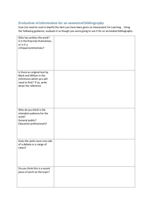 Emporia state university libraries and archives eg 102 annotated bibliography worksheet part 1 as you consider information sources, take several minutes to . Download or preview 4 pages of pdf version of annotated bibliography worksheet (doc: You can use this worksheet as you review your sources to help make notes to use for your annotated bibliography and/or literature review:. Using appeal (video, 6:26) and use the appeal evaluation worksheet. Therefore, an annotated bibliography includes a summary and/or evaluation of each of the sources.